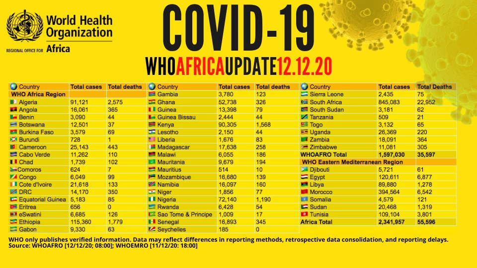Au 12 décembre 2020, + de 2 300 000 cas de COVID-19 en Afrique - avec + de 1 900 000 guérisons associées et 55 000 décès signalés.