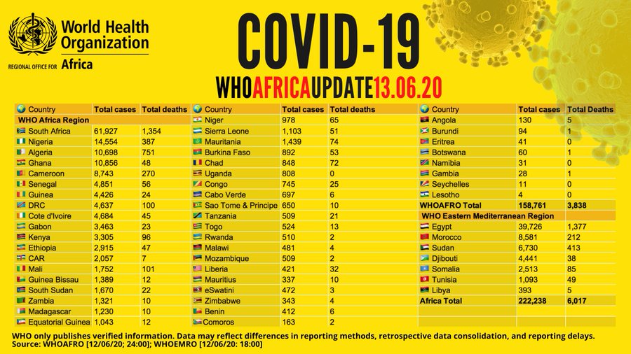 Au 13 Juin 2020 : Plus de 222 000 cas de COVID19 en Afrique - avec plus de 101 000 guérisons associées et 6 000 décès signalés. Consultez les chiffres par pays sur le tableau de bord COVID-19 de l'OMS pour la Région Afrique : https://arcg.is/XvuSX