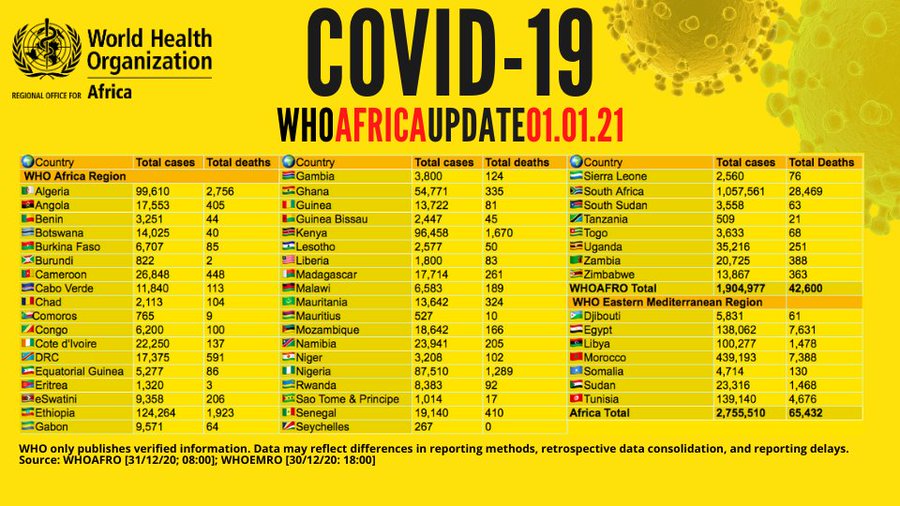 Back To Press Release Coronavirus - Africa: COVID-19 Update (1 January 2021) All (1) Images (1) Coronavirus - Africa: COVID-19 Update (1 January 2021) (Source: WHO Regional Office for Africa | 5 years ago) Share Download HD Download SD Image