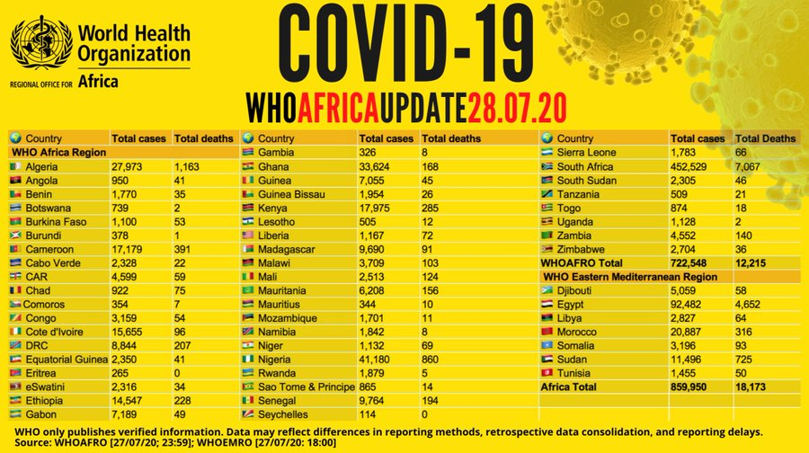 Back To Press Release Coronavirus - Africa: COVID-19 update (28 July 2020) All (1) Images (1) Coronavirus - Africa: COVID-19 update (28 July 2020) (Source: WHO Regional Office for Africa | 5 years ago) Share Download HD Download SD Image