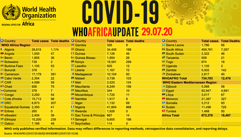 Back To Press Release Coronavirus - Africa: COVID-19 update (29 July 2020) All (1) Images (1) Coronavirus - Africa: COVID-19 update (29 July 2020) (Source: WHO Regional Office for Africa | 5 years ago) Share Download HD Download SD Image