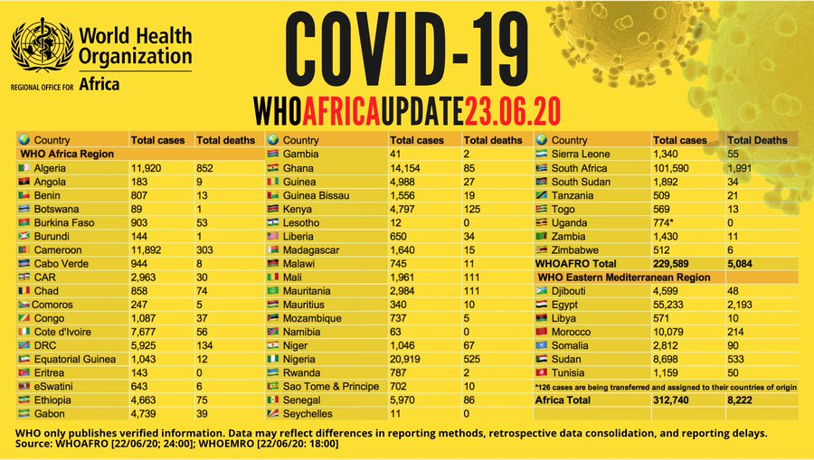 Back To Press Release Coronavirus - Africa: COVID-19 WHO Africa Update 23 June 2020 All (1) Images (1) Coronavirus - Africa: COVID-19 WHO Africa Update 23 June 2020 (Source: WHO Regional Office for Africa | 5 years ago) Share Download HD Download SD Image