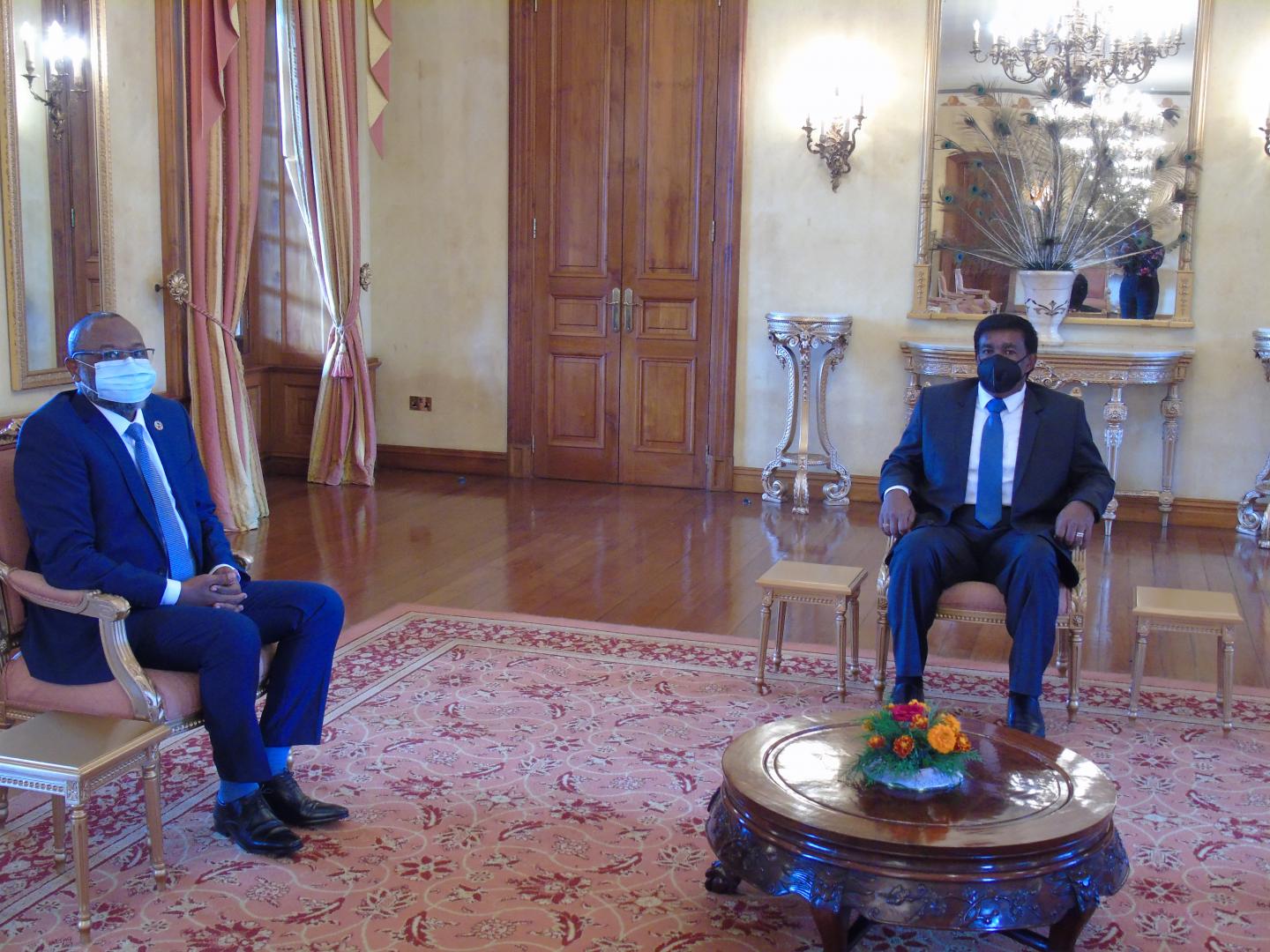 Dr Laurent Musango, WHO Representative in Mauritius discussing WHO support to the country with His Excellency Mr Prithivirajsing Roopun, the President of the Republic of Mauritius